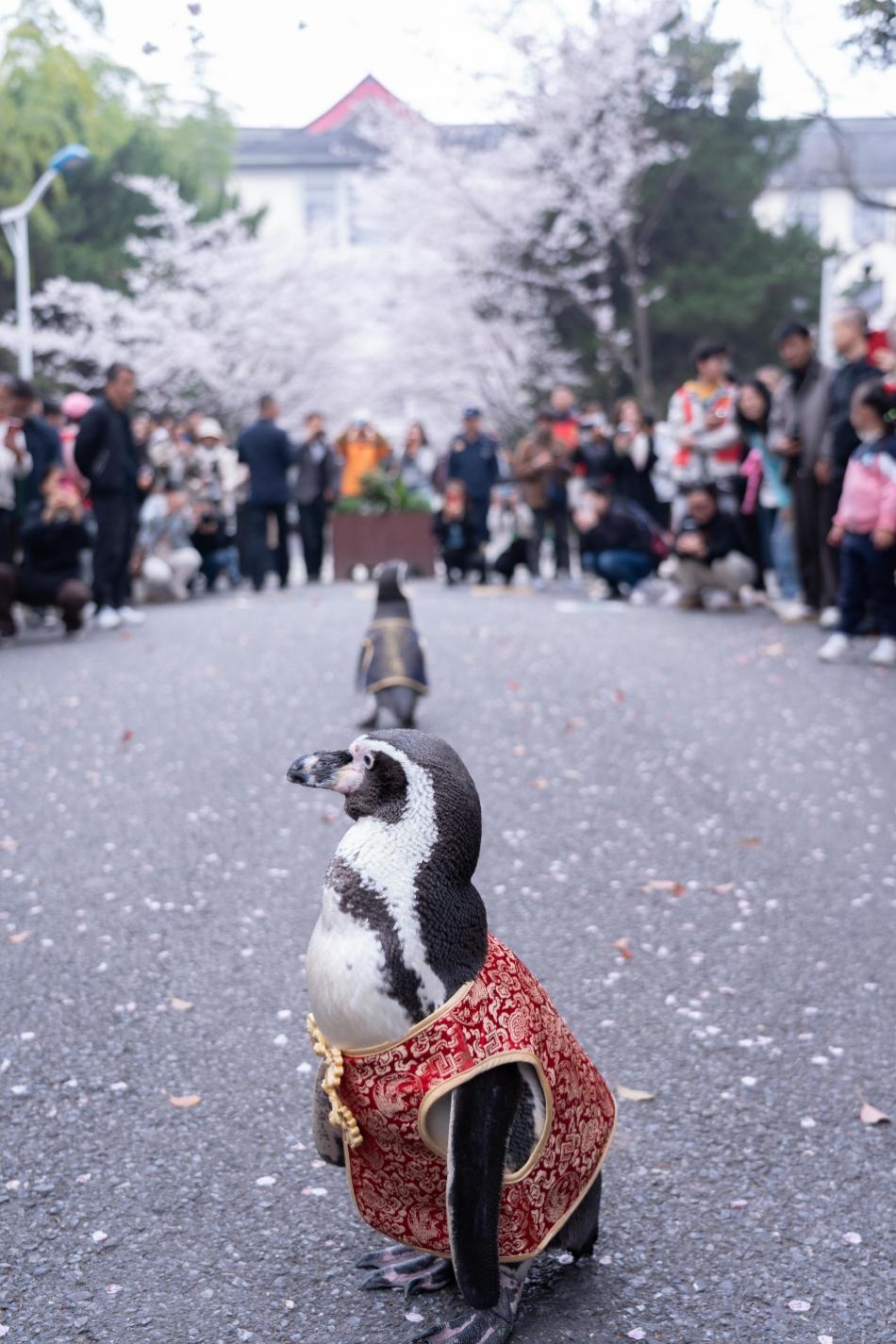 而在文化节开幕的前一天,3月26日,一场春日限定的“浪漫奇遇”已经提前引燃了校园的热情。来自南京海底世界的洪氏环企鹅“大个子”和“Q宝”,作为第九届生态文化节的“海洋科普大使”,身穿南京非遗云锦服装,摇摇摆摆地走进南林校园。为此,南林大保卫部(处)会同活动主办方图书馆、党委宣传部、校团委和南京海底世界,提前制定专项安保方案,避开周末大客流,在现场设置安全观赏区,配备饲养员全程看护,并由安保与志愿者团队共同维护秩序,确保这场“云锦企鹅巡游记”在动物友好原则下顺利开展。“共享优美校园环境,感受高校文化氛围,让市民假期更具人文气息与教育温度。”朱捷表示。
