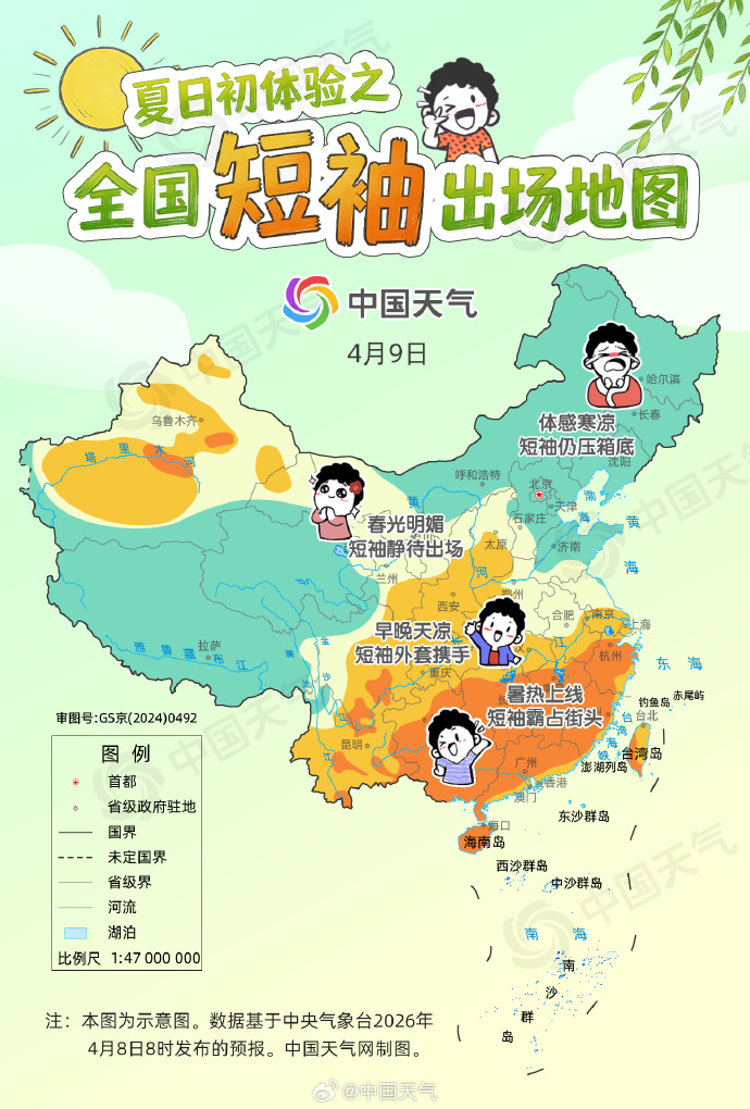 从全国趋势来看,未来三天我国大部气温整体波动上升,南方30℃以上高温范围持续扩大,华北、黄淮多地也将升至25℃以上。9日华南暑热持续,海南等地高温在线,短袖稳稳霸占街头;江南部分地区最高气温冲上30℃,江苏南部白天暖意融融,但早晚凉意明显,适合“短袖+外套”的洋葱式穿衣法。