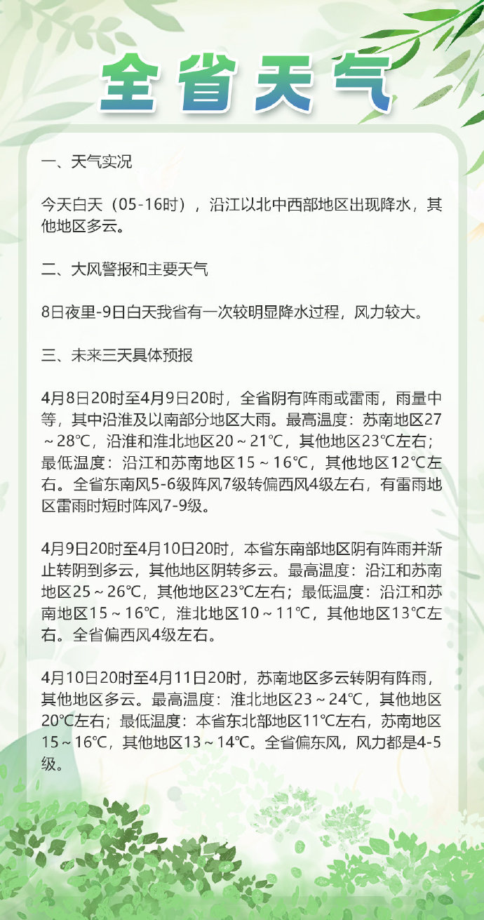 4月8日20时至4月9日20时,全省阴有阵雨或雷雨,雨量中等,其中沿淮及以南部分地区有大雨。最高温度:苏南地区27~28℃,沿淮和淮北地区20~21℃,其他地区23℃左右;最低温度:沿江和苏南地区15~16℃,其他地区12℃左右。全省东南风5~6级阵风7级转偏西风4级左右,有雷雨地区雷雨时短时阵风7~9级。
