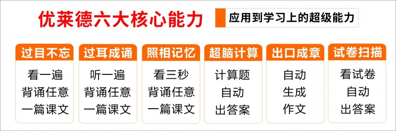 据张槿璇介绍,优莱德6大能力是:过目不忘能力,读一遍即背诵;过耳成诵能力,听一遍即背诵;照相记忆能力,也就是撒贝宁拥有的能力,看3秒钟,即可背诵一篇课文或者古诗等,这三个记忆能力解决了学生背诵的问题;第四大能力是超脑计算,学过计算逻辑后,计算题自动出答案,解决了计算题问题;第五大能力是出口成章,像AI一样,可以自动生成一篇作文,解决了学生写作的问题;第六大能力是试卷扫描能力,只需把试卷用眼睛扫描一遍,自动出答案,这个能力解决了学生考试答题的问题,六大能力覆盖背诵、计算题、作文和考试答题四大应用领域,无死角覆盖语数英理化史地政生等全学科。