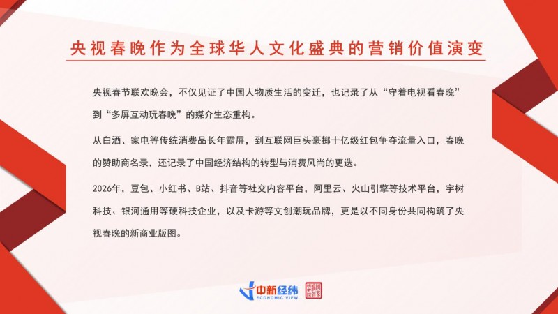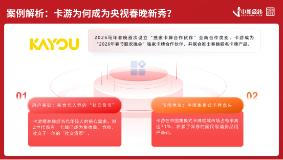 央视春晚的赞助商名录,就像一部浓缩的中国消费风尚变迁史。从改革开放后白酒、家电等传统消费品凭借春晚的舞台实现品牌出圈,到移动互联网时代微信、支付宝、淘宝等互联网巨头借助春晚完成用户规模的 “最后一公里” 突破,再到短视频时代快手、抖音、京东等平台与春晚深度绑定,争夺下沉市场,每一个阶段的春晚舞台,都站着当时最具代表性的行业与品牌,也映射着当时主流消费群体的消费特征。2026 马年春晚,当卡游以 “独家卡牌合作伙伴” 的身份出现在舞台上,与 AI、机器人等科技创新企业并肩成为春晚的新主角,这不仅是一个品牌的成功破圈,更折射出 Z 世代主导的消费时代已然到来,而文化认同与情绪价值,正是解锁这一代消费群体的核心密码。
