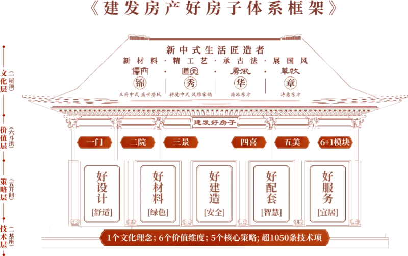 为让“好房子”从理念落地为可感知的生活品质,建发房产搭建“文化—价值—策略—技术”四维一体完整框架,以“一门、二院、三景、四喜、五美、六模块”六重价值体系,将东方礼序与美学转化为日常居住场景。同时围绕好设计、好材料、好建造、好配套、好服务五大核心策略,以超1050条技术标准为支撑,全面覆盖安全、舒适、绿色、智慧、宜居五大核心人居需求,从设计研发、材料选用、工程建造到社区配套、物业服务,实现全流程品质管控。