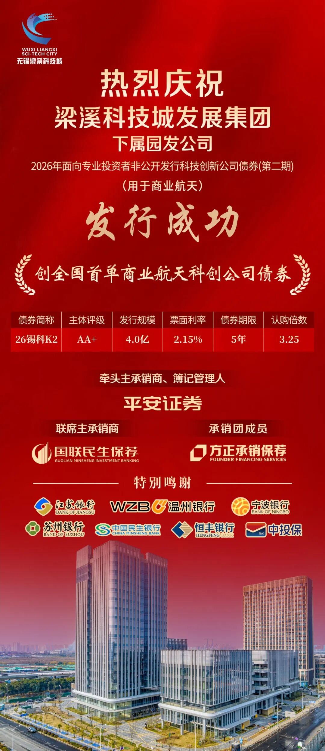 本期商业航天科技创新专项公司债券由平安证券担任受托管理人和主承销商,国联民生承销保荐担任联席主承销商,江苏银行、温州银行、宁波银行、苏州银行、民生银行、恒丰银行等多家优质金融机构踊跃参与认购,充分体现了资本市场对梁溪科技城集团综合实力、经营效益和未来前景的高度认可。