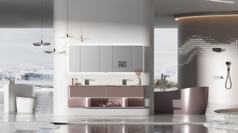 这一次,帝王洁具的“破与立”不再局限于材质与色彩,而是依托帝欧水华集团”人工智能+”战略,引入了“AI科技”这一关键变量。在美学维度,帝王推出“四季系列”及高端定制产品,以自然意象与情感叙事回应人居空间的精神需求;在功能维度,帝王将AI健康管理、智能美妆建议等系统融入浴室柜设计,使其从一件“静态家具”进化为能够主动感知、分析并服务用户的“智能终端”。