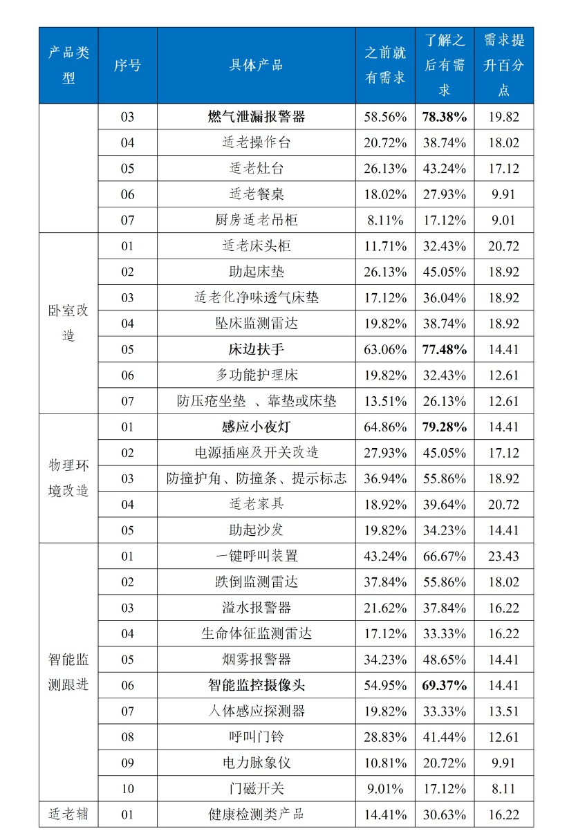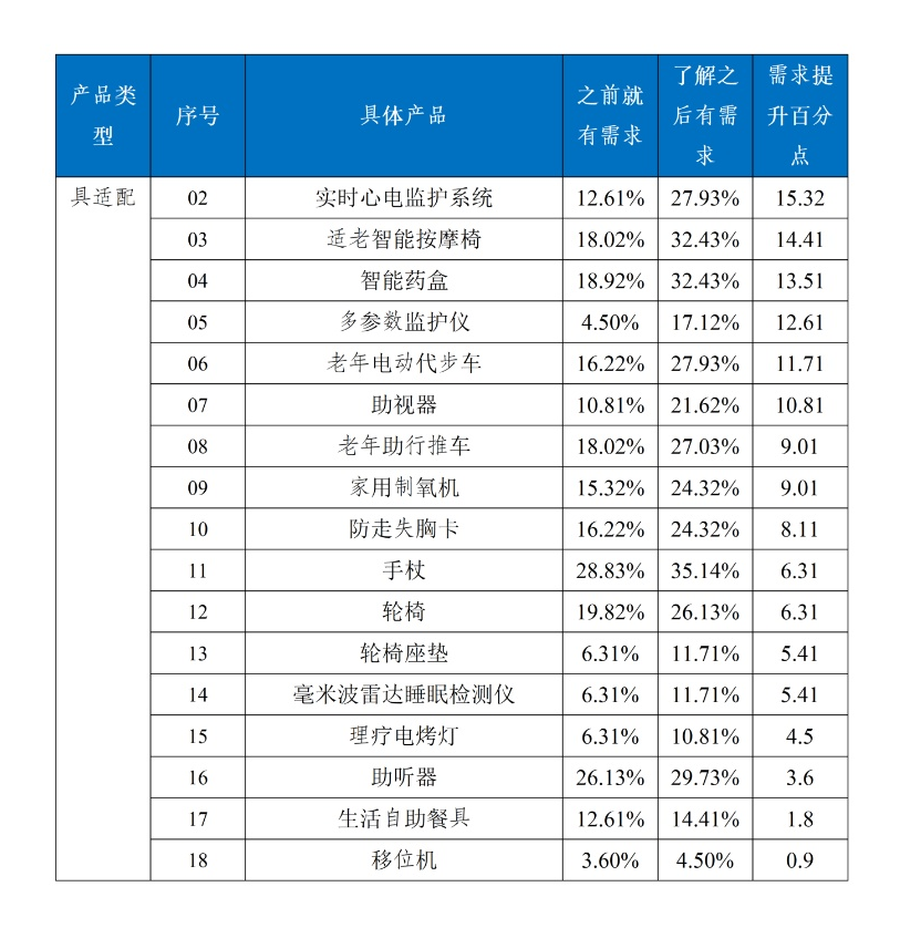 值得注意的是,受访者对产品的了解程度影响对产品的需求程度。在68款产品中平均每位受访者勾选了26.53款需求产品,其中之前就考虑购买的产品有17.41款,了解之后增加需求的产品有9.12款。在了解产品清单之后,对各类产品的需求程度均有不同幅度的提升。