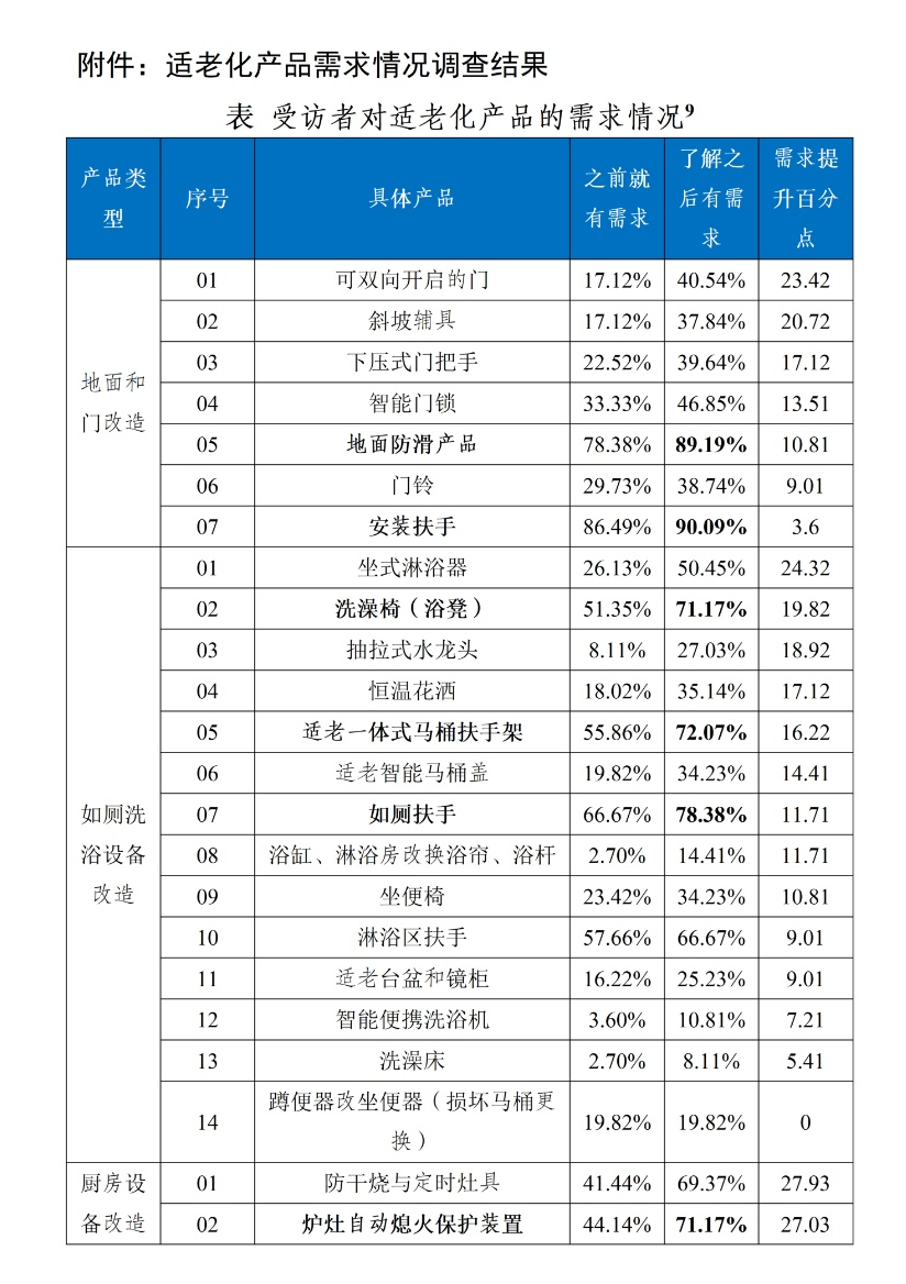 就改造内容而言,升级居家产品性能、适老预防居家设计、优化物理空间布局是老年人家庭的主要需求。目前省内适老化改造产品清单涉及的产品中,受访者对不同产品的需求程度存在差异。地面和门改造方面,地面防滑产品和扶手需求程度相对较高,需求比例均在90%左右;如厕洗浴设备改造方面,适老一体式马桶扶手架、如厕扶手、洗澡椅(浴凳)需求程度相对较高,需求比例均在70%以上;智能监测跟进类产品方面,一键呼叫装置、智能监控摄像头需求程度相对较高,需求比例接近70%。