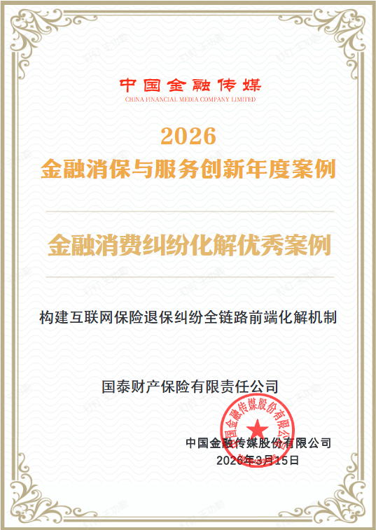 2026年3月15日,“2026金融消保与服务创新年度案例评选”结果正式揭晓,国泰财产保险有限责任公司(以下简称“国泰产险”)凭借《构建互联网保险退保纠纷全链路前端化解机制》案例,成功斩获“金融消费纠纷化解优秀案例”荣誉,彰显了公司在消费者权益保护领域的专业实力与创新实践,也标志着行业对国泰产险消保工作的高度认可。
