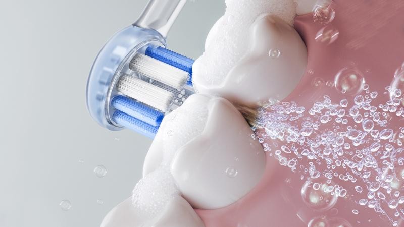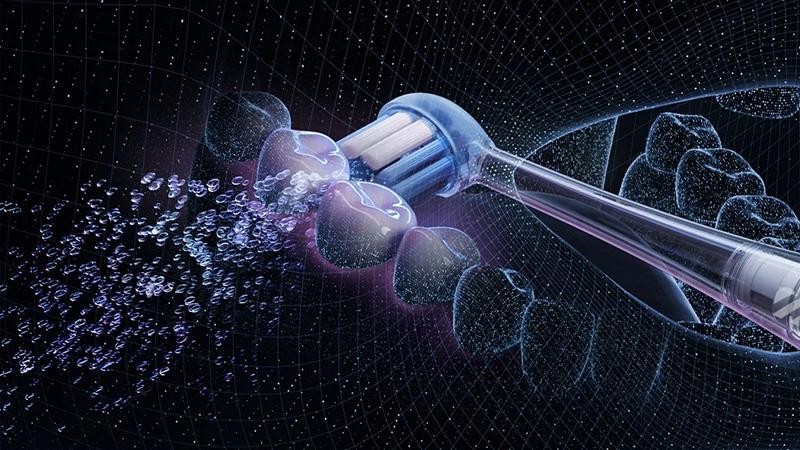 关键在于锐舞电动牙刷的清洁介质从“刷毛”换成了“气泡”。传统电动牙刷无论震频多高,本质上仍是刷毛与牙齿的物理摩擦。而气泡作为流体,可以无缝填充牙缝、牙龈沟等刷毛难以触及的区域,同时避免了刷毛对牙龈的直接冲击。这些微气泡在破裂瞬间释放能量,可高效清除牙菌斑,而非依赖刷毛的暴力摩擦。