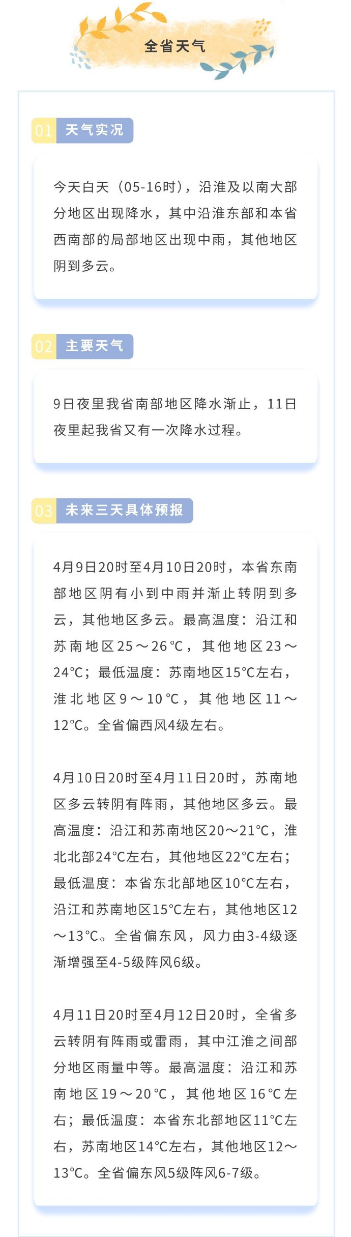 4月9日20时至4月10日20时,本省东南部地区阴有小到中雨并渐止转阴到多云,其他地区多云。最高气温:沿江和苏南地区25~26℃,其他地区23~24℃;最低气温:苏南地区15℃左右,淮北地区9~10℃,其他地区11~12℃。全省偏西风4级左右。