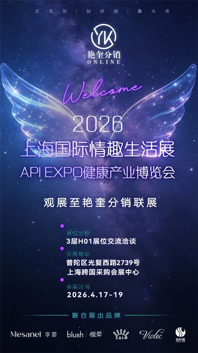 2026 年 4 月 17 日,以“未来之眼・趣动全球”为主题的上海国际情趣生活及健康产业博览会(2026API上海成人展)于上海跨国采购会展中心盛大启幕。深耕行业二十余载的艳奎情趣分销以「智供链・新生态・悦未来」为核心主题,携享要、Blush檀晕、ZALO、Viotec 紫罗兰及春色源五大联展品牌一起亮相本次展会,以多元产品矩阵、前沿创新成果及全球化供应链实力,成为本届展会备受关注的焦点展区。