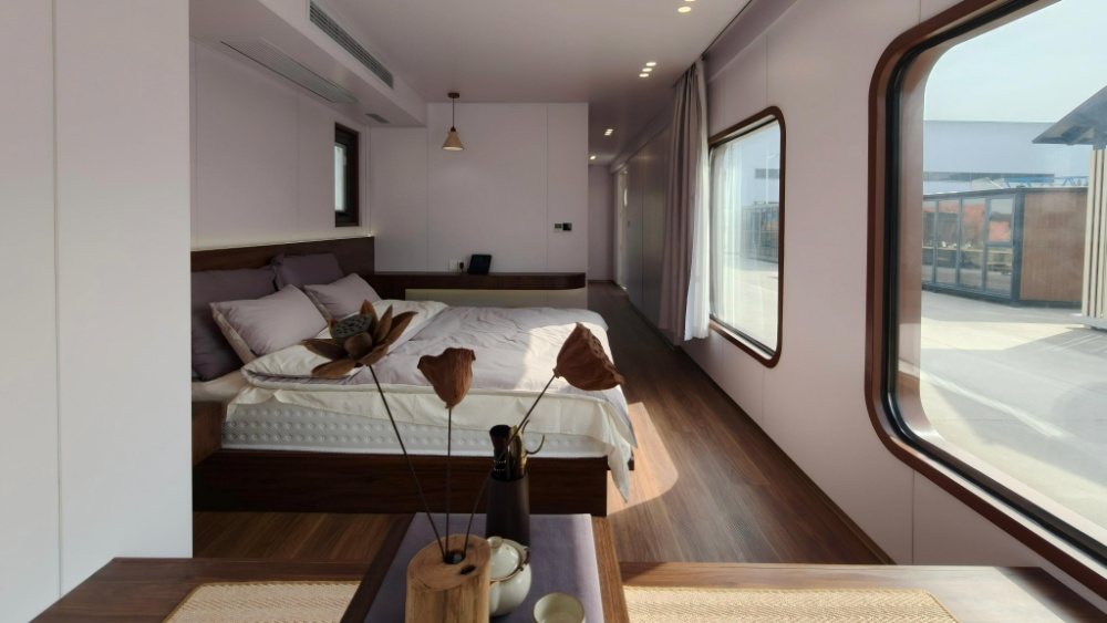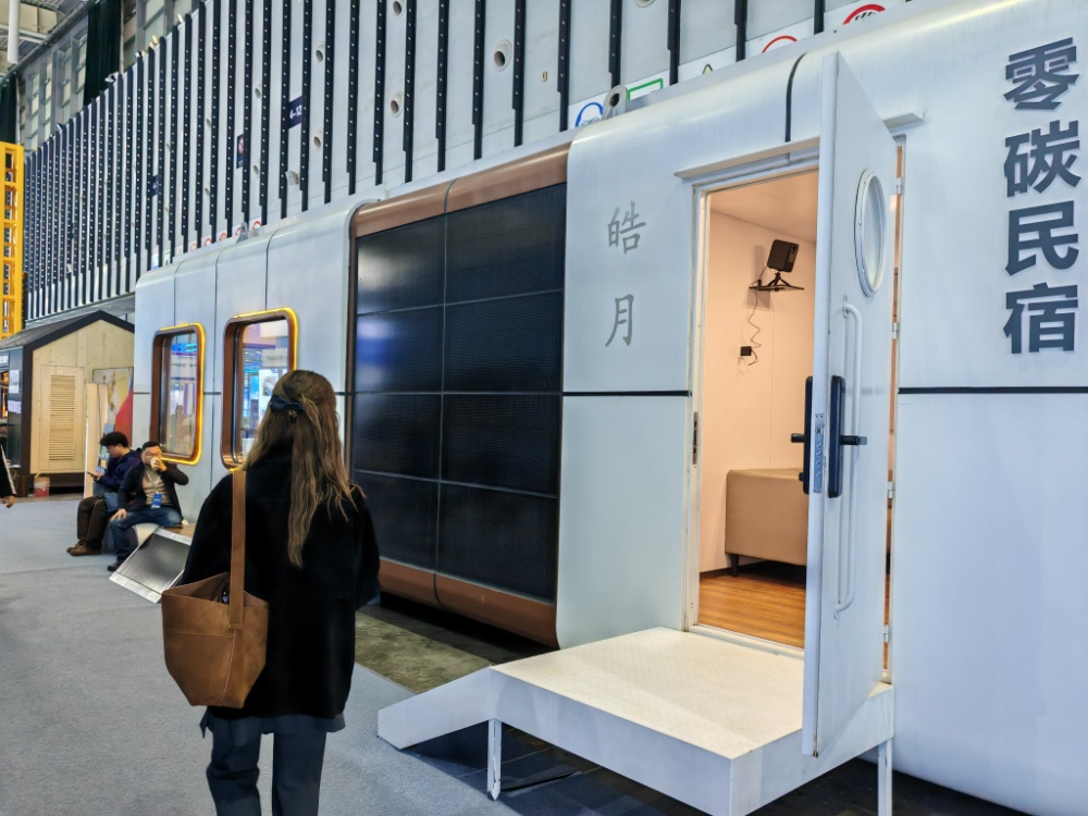 江苏新阳光智顶科技常务副总经理李耀成介绍,这是他们公司推出的“零碳移动建筑”,一款会“产电”的零碳移动建筑。建筑墙体等采用定制的光伏组件,替代传统建材,兼具遮风挡雨、美观装饰与高效发电功能,让建筑成为自带的绿色发电站,从源头实现能源清洁生产。