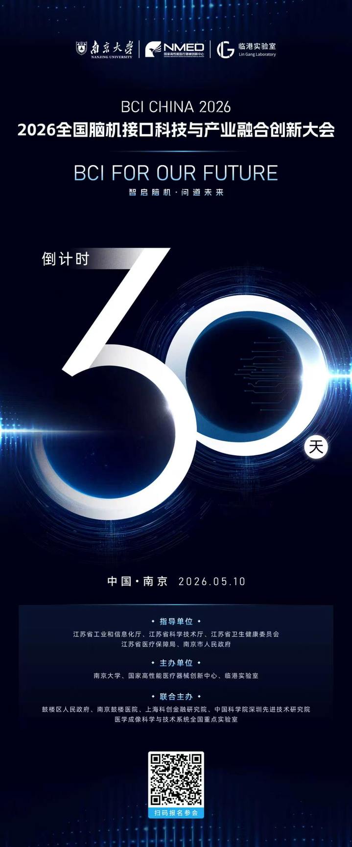 本次会议实行网上预约参会,请扫描海报二维码完成报名。更多大会动态资讯,敬请关注“南京大学脑机接口研究院”“南智脑机”“国家高性能医疗器械创新中心”“临港实验室”“鼓楼微讯”等官方微信公众号。期待5月10日与您相聚金陵,共启脑机接口产业新篇章。