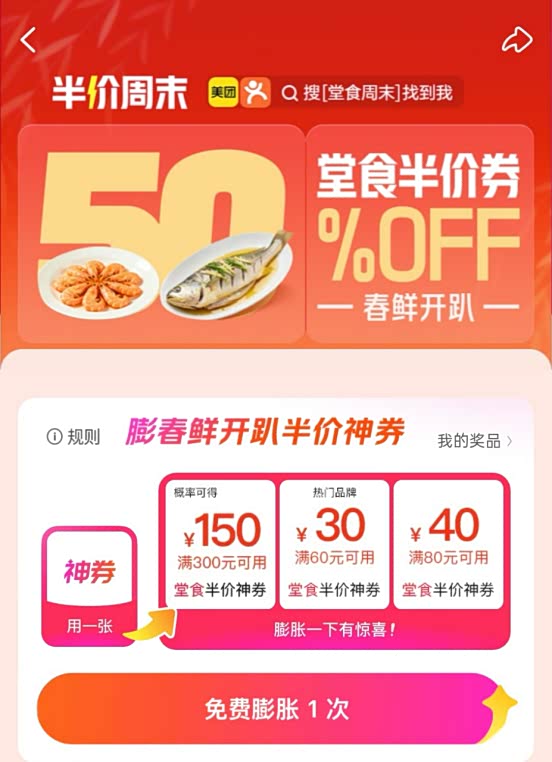 春意渐浓,线下餐饮消费活力持续释放。从朋友间的周末欢聚,到亲子家庭的踏青就餐,各类聚餐需求叠加释放,推动餐饮市场热度稳步攀升。抓住这个节点,美团于4月11日上线以“春季尝鲜半价”为主题的“堂食周末”活动,消费者打开美团App搜“堂食周末”,有机会获取半价神券,下单即可享受半价优惠,最高可领取300-150元半价神券,让利于民,以实际行动助力消费者畅享品质美食。