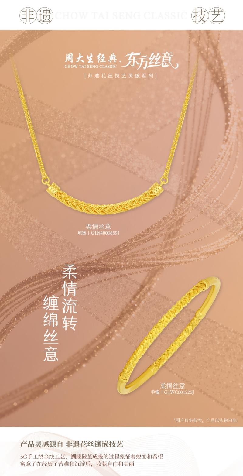 柔情流转,缠绵丝意。周大生经典东方丝意系列新品“柔情丝意”,以5G手工绕金线工艺重释东方丝韵。匠人执金为丝,手工拉制细如毫发的金线,令黄金表面流转绸缎般的光影;再以手工编织批管元素缠绕交织,层叠生姿。随步履轻移,“柔情丝意”更跃动高贵暖金光泽;几何线条简约大气,尽显从容贵气,让每一位佩戴“柔情丝意”的女性于颈腕舒展间尽释魅力。