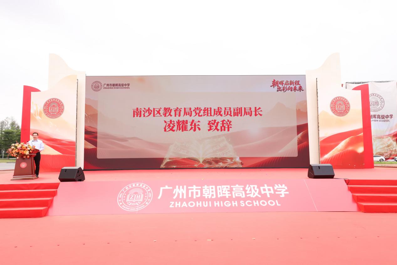 南沙区教育局凌副局长代表区教育局致辞,对广州市朝晖高级中学揭牌更名表示热烈祝贺。他指出,南沙始终坚持教育优先发展战略,持续优化教育布局,朝晖高级中学的全新启航,是南沙民办教育提质增效的重要成果。他对学校未来发展寄予厚望,希望学校深耕内涵、彰显特色,全体教师潜心育人、匠心执教,广大学子勤学奋进、逐梦成长,区教育局也将全力支持学校发展,助力学校打造区域教育标杆。