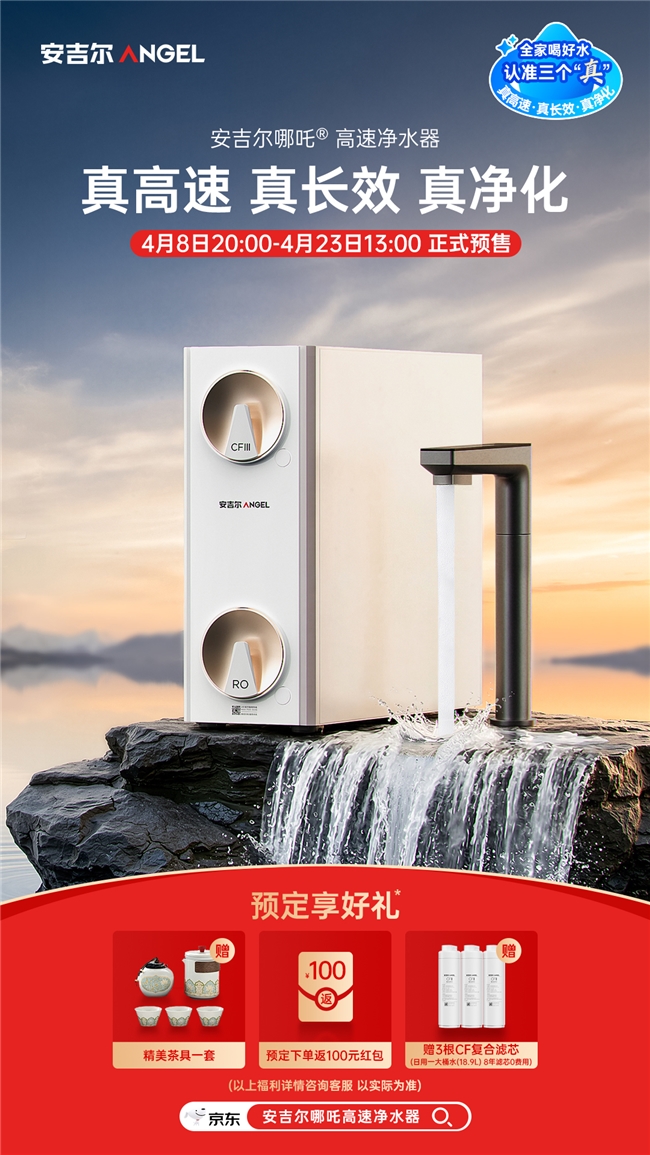安吉尔哪吒高速净水器将于2026年4月23日13时正式发布,其中1600G款首发活动价3298元,1400G款首发活动价2898元,现在预定还能享受超多福利好礼,包括不限于精美茶具、预定免100元定金、赠送3根CF复合滤芯(日用一大桶水18.9L,8年滤芯0费用)及其他换购福利等,欢迎前往安吉尔天猫、京东旗舰店选购。