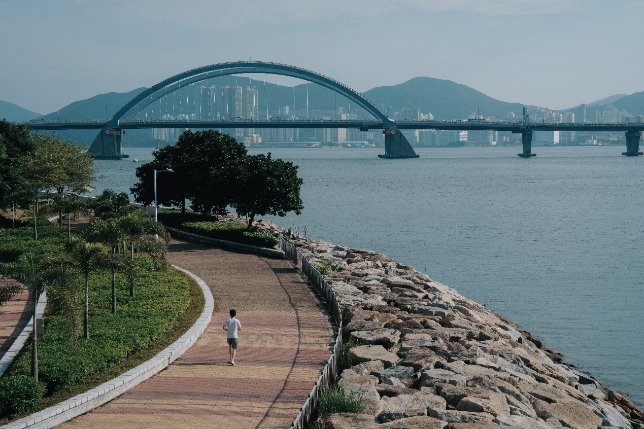黄昏时分,在日出康城海滨长廊欣赏日落洒金的波光海面,眼前的跨湾大桥呈现出与早晨截然不同的晚霞壮丽之美。这一刻,仿佛进入港剧主角视角下的黄金时代繁华之都,浪漫指数满分,令人沉醉。