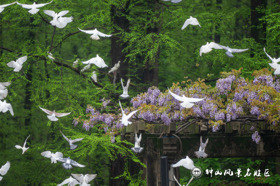 初开的紫藤花顺着弧形廊架蜿蜒垂下,紫雾般连绵成帘,成群白鸽时而静立石阶,时而振翅盘旋,白羽掠过紫藤花影,翅膀带起细碎风声,与台间隐约的乐声交织。