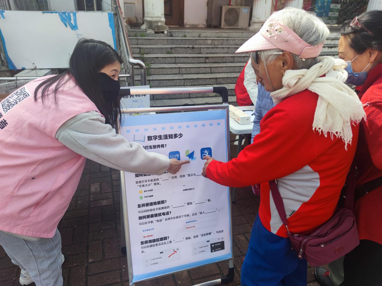 在“指尖相伴·数字答疑”摊位中,社区志愿者为居民提供一对一指导,围绕微信使用、扫码操作、线上挂号等常见功能进行讲解。同时设置“手机使用情景填空”互动海报,引导居民结合生活场景进行思考与尝试。通过讲解与实际操作相结合的方式,帮助老年居民逐步掌握基本操作方法,增强使用信心。