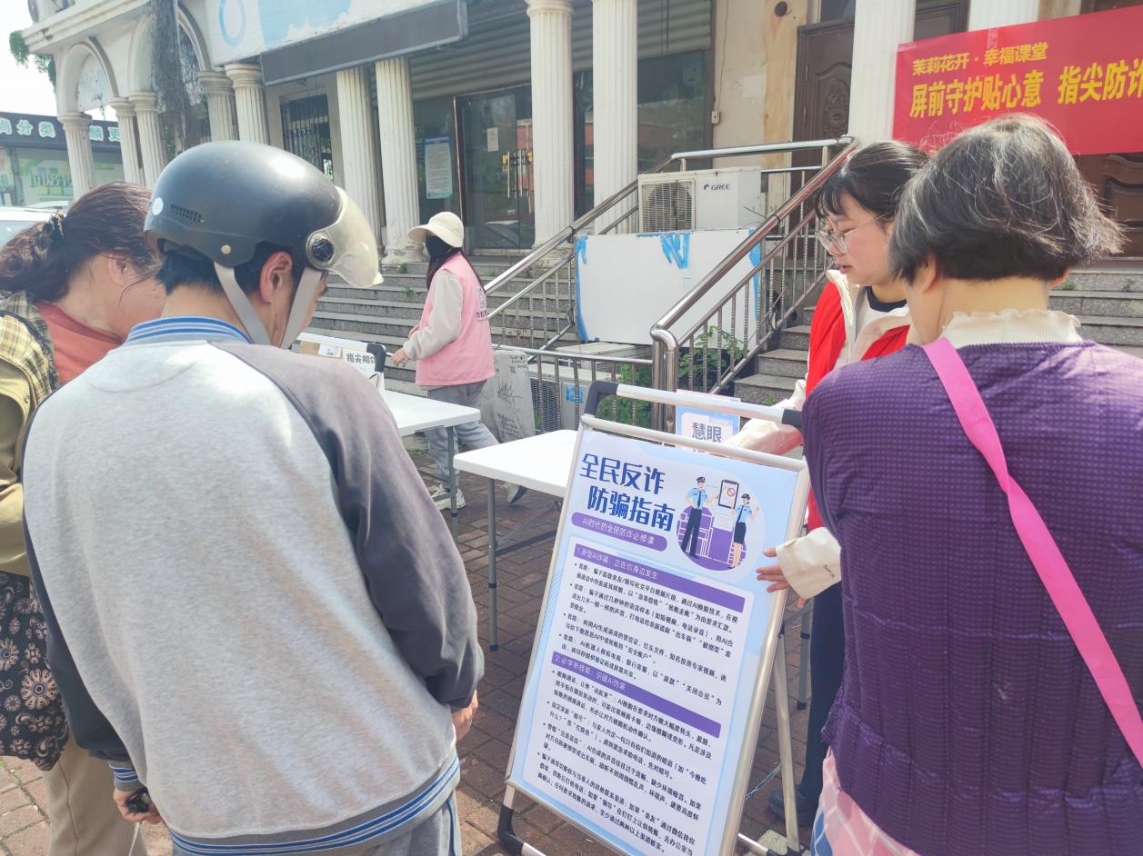 “慧眼识诈·反诈情景辨析”摊位则围绕常见诈骗类型展开。社区志愿者通过情景展示与互动问答,引导居民识别电话诈骗、虚假信息及陌生链接等风险情境,并总结防范要点。参与居民在讨论与判断中加深了对诈骗套路的认识,提升了安全防范意识。