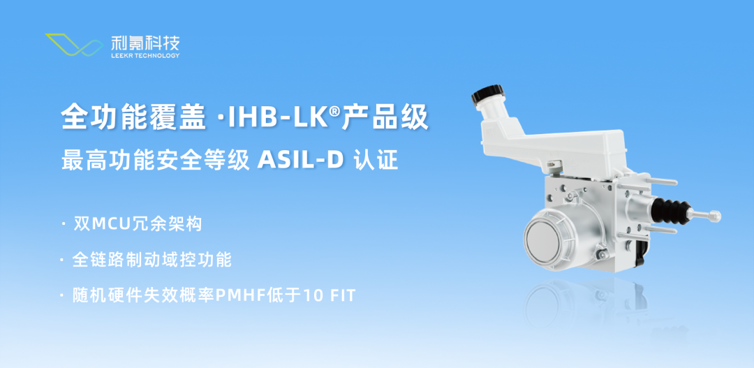 结合此前获得的《ISO 26262功能安全流程认证》,利氪科技IHB-LK产品开发从芯片选型、系统架构、软件安全机制等达到ASIL-D最高级,同时满足全功能覆盖的功能安全ASIL-D认证,能更好地满足主机厂对底盘系统功能安全等级的要求。