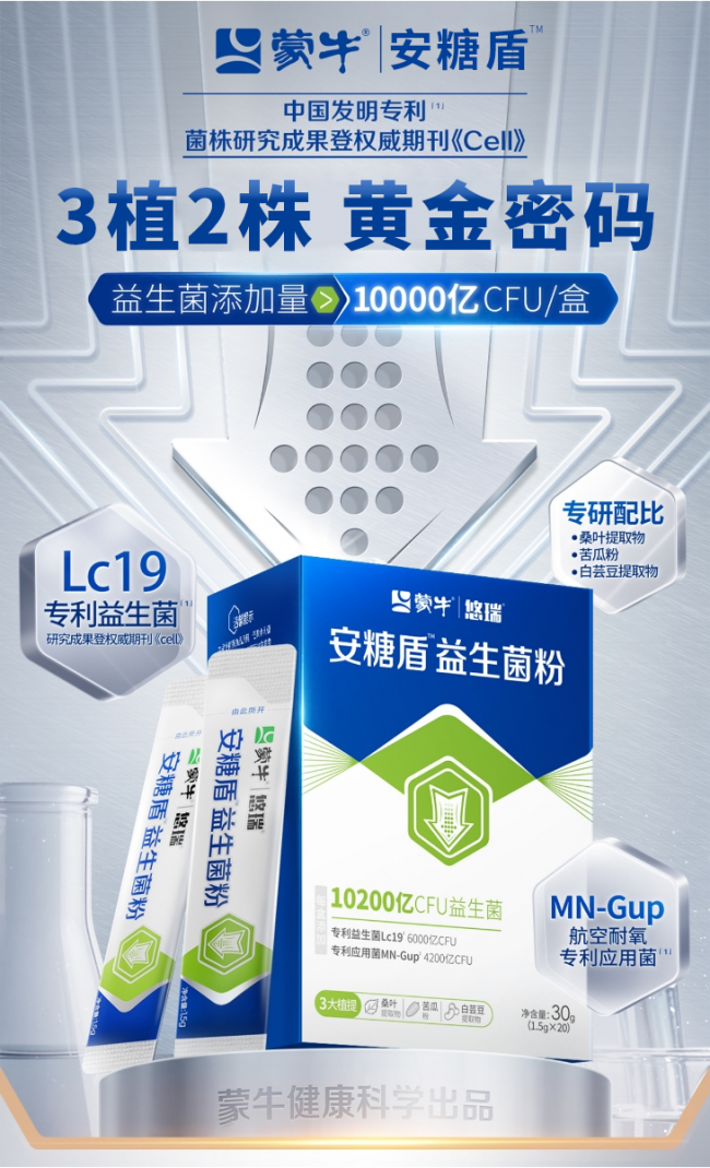 长期以来,中国益生菌产业的核心技术面临着挑战。蒙牛率先在2010年实现自主菌研发突破,建立起一个包含超过1.9万株自主菌株的菌种库,通过体系化技术解决方案,在益生菌研究中达到国际领先水平。蒙牛安糖盾益生菌粉的核心竞争力,便源自其自主研发的“两株菌+三植提”黄金组合。