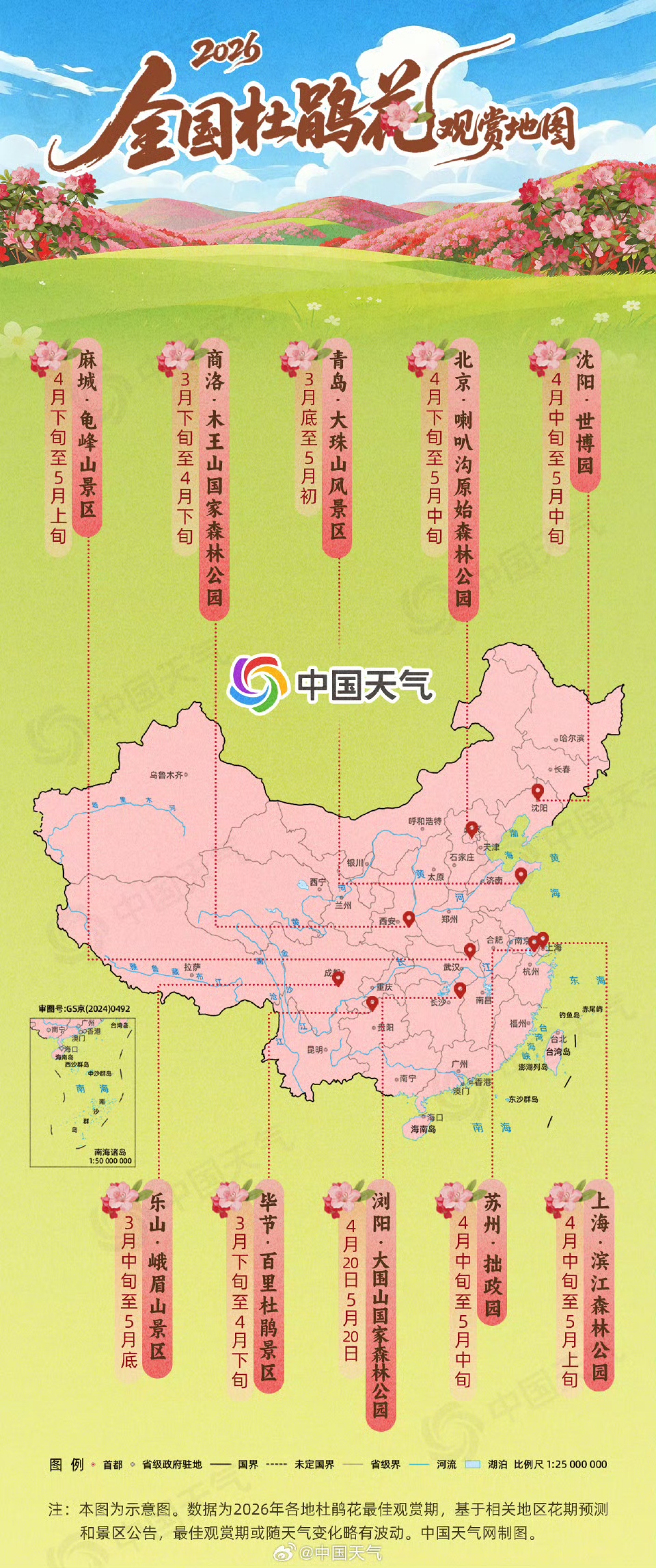 全国各地赏鹃佳期陆续到来。南方多地率先进入最佳观赏时段,四川峨眉山、贵州毕节、陕西木王山等景区杜鹃盛放正盛,华北、华东多地也将迎来杜鹃盛景。江苏春日杜鹃迎来最佳观赏窗口期,苏州拙政园园内杜鹃含苞待放、即将绚烂绽放,园林与繁花相映成趣,尽显江南春日雅致韵味。省内各地气温温和适宜,十分适合外出踏青寻芳,漫步园林山野,尽赏暮春限定杜鹃美景。
