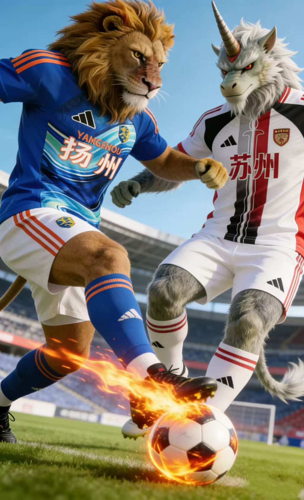 且说两队对阵,先有市井趣谈,成足坛笑柄,更添几分对抗之意。苏州队徽,甪端神兽,形制圆润,恰与某汉堡品牌神似,球迷皆呼其为“汉堡神兽”,以西式快餐为号,尽显吴地新潮锐气。反观扬州队徽,雄狮怒吼,乃淮扬名馔“狮子头”形意,其麾下更有天下闻之扬州炒饭,粒粒劲道,香飘千里,乃中式快餐之魁首,千年烟火,一脉相传,球迷皆以“炒饭雄狮”相称。