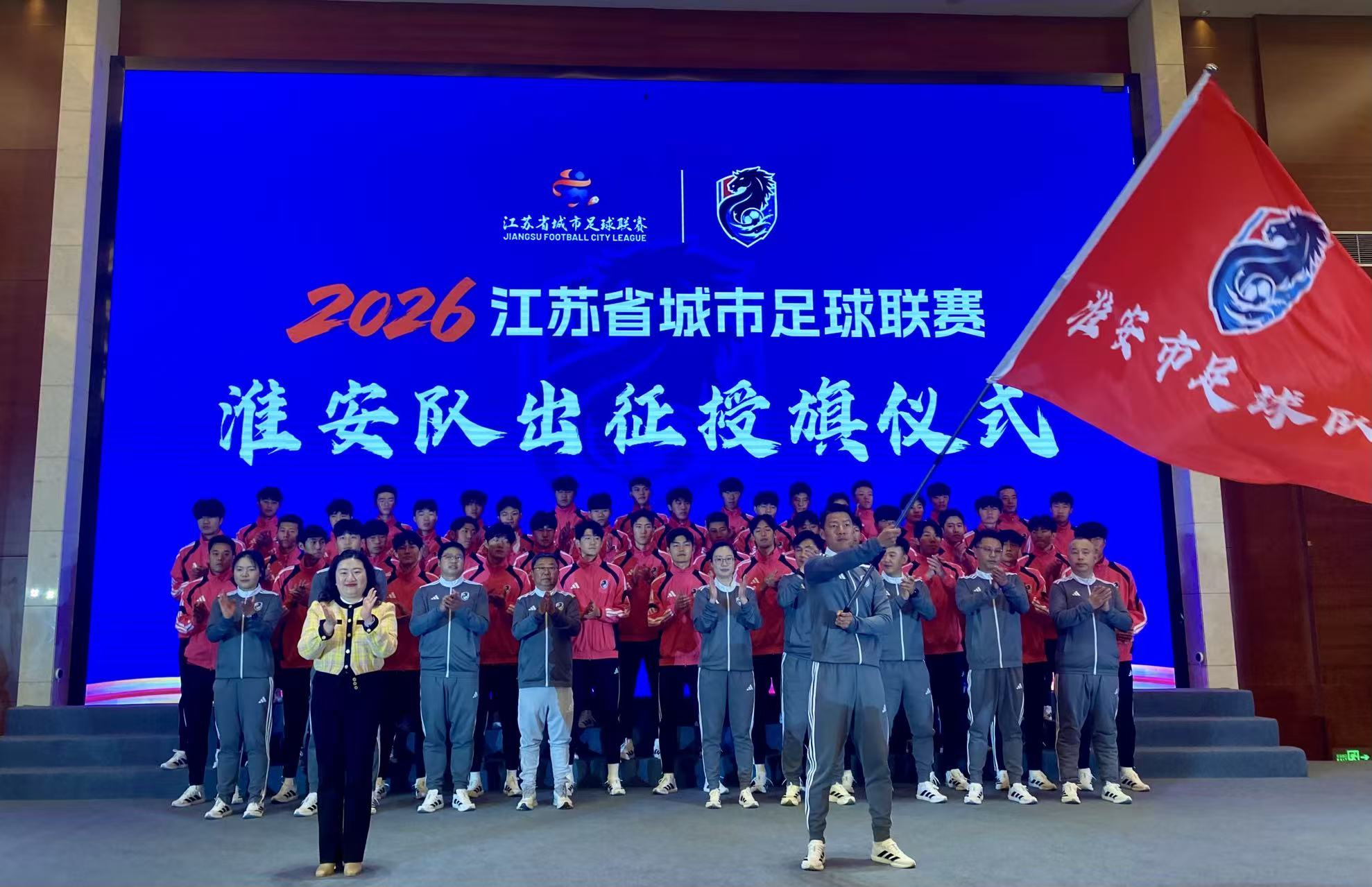 交汇点讯 “不相信有完成不了的任务,不相信有克服不了的困难,不相信有战胜不了的对手。此战必胜!”4月10日上午,2026江苏省城市足球联赛(以下简称“苏超”)淮安队出征授旗仪式举行。现场,淮安队全体成员登台亮相,在主教练董松带领下庄严宣誓,铿锵有力、整齐洪亮的誓言将现场气氛推向高潮。