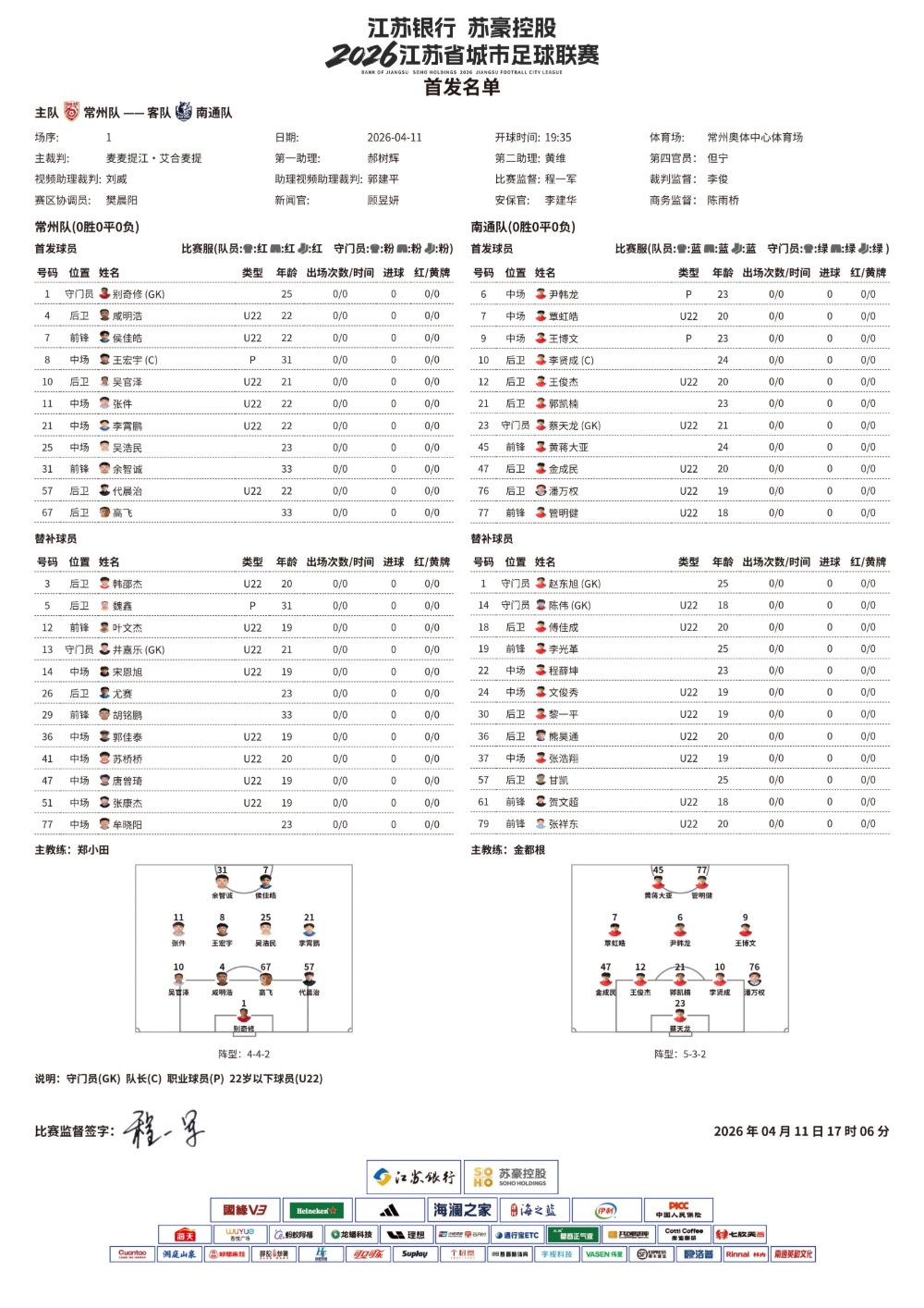 2026“苏超”揭幕战,常州队VS南通队首发名单