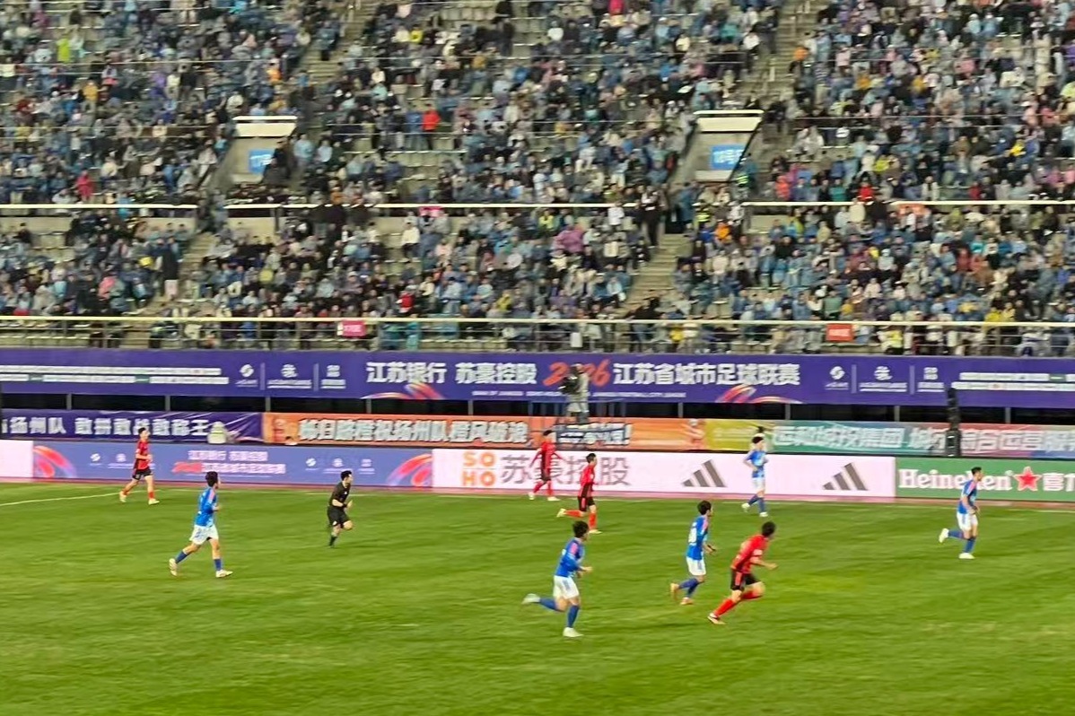 整场赛事,两队皆以青春阵容,拼劲十足,攻势各有千秋,防守互有章法。怎可惜,下半场中,扬州队一时防守疏忽,阵型左肋空档防守漏人,被苏州队攻入一球。此后,双方继续调兵遣将,小将老将轮番上阵,酣畅厮杀。看台之上,双方球迷亦是不甘示弱,人声鼎沸,呼声震天。