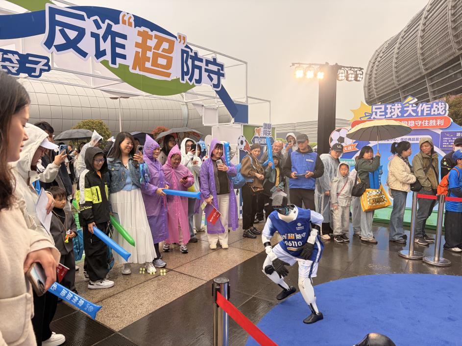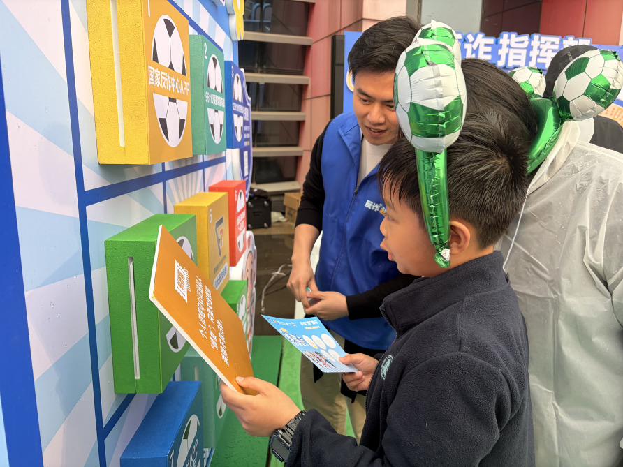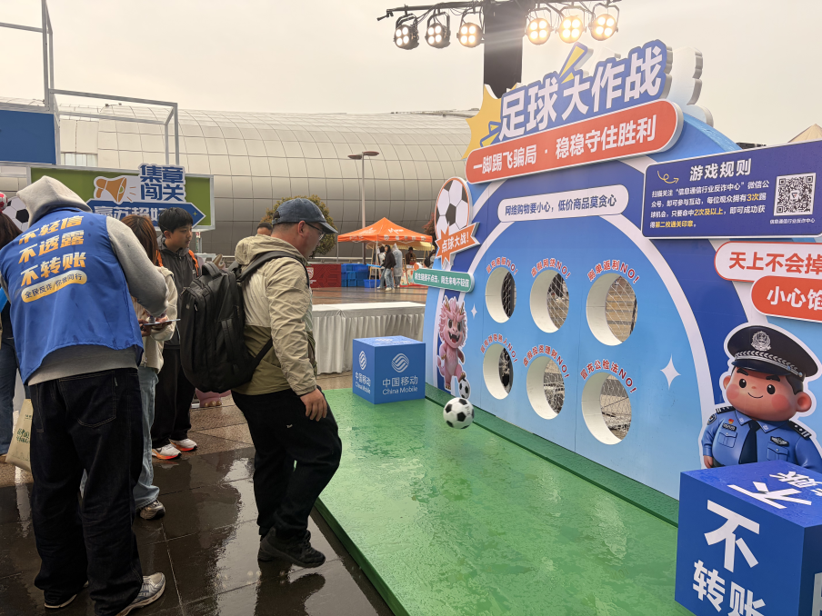 “所有打着‘刷单返利’旗号的兼职,都是诈骗,对还是错?”AI机器人发问。“对!”一位年轻球迷脱口而出。“96110一定要接听吗?”“对!”“航班取消短信能点链接操作吗?”“错!要去官方APP核实!”几位球迷甚至主动向“考官”发起挑战。另一边的“反诈盲盒猜猜猜”区域同样人气高涨,随机抽取盲盒作答,答对即可抽奖;AI合拍机前,上传自拍照,10秒左右便能生成反诈主题虚拟背景写真;足球大作战的射门游戏也围满了人,大家轮番上阵,踢向贴满诈骗关键词的球门。现场掌声与笑声交织,气氛愈发热烈。