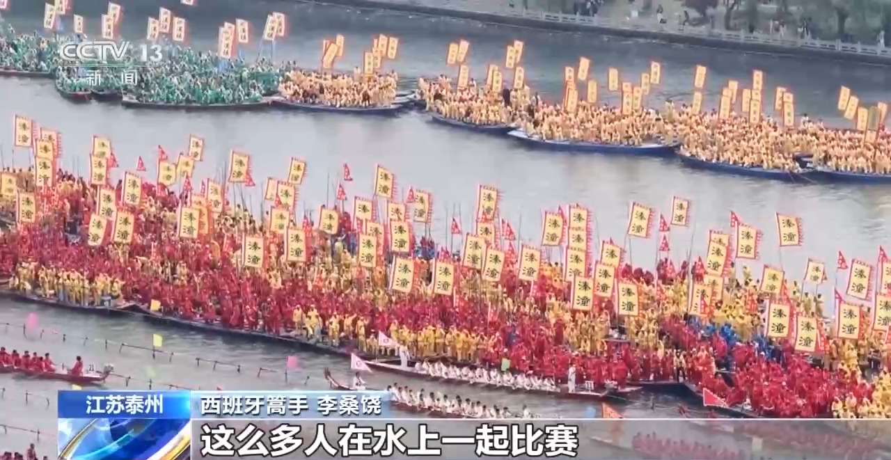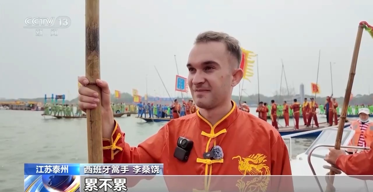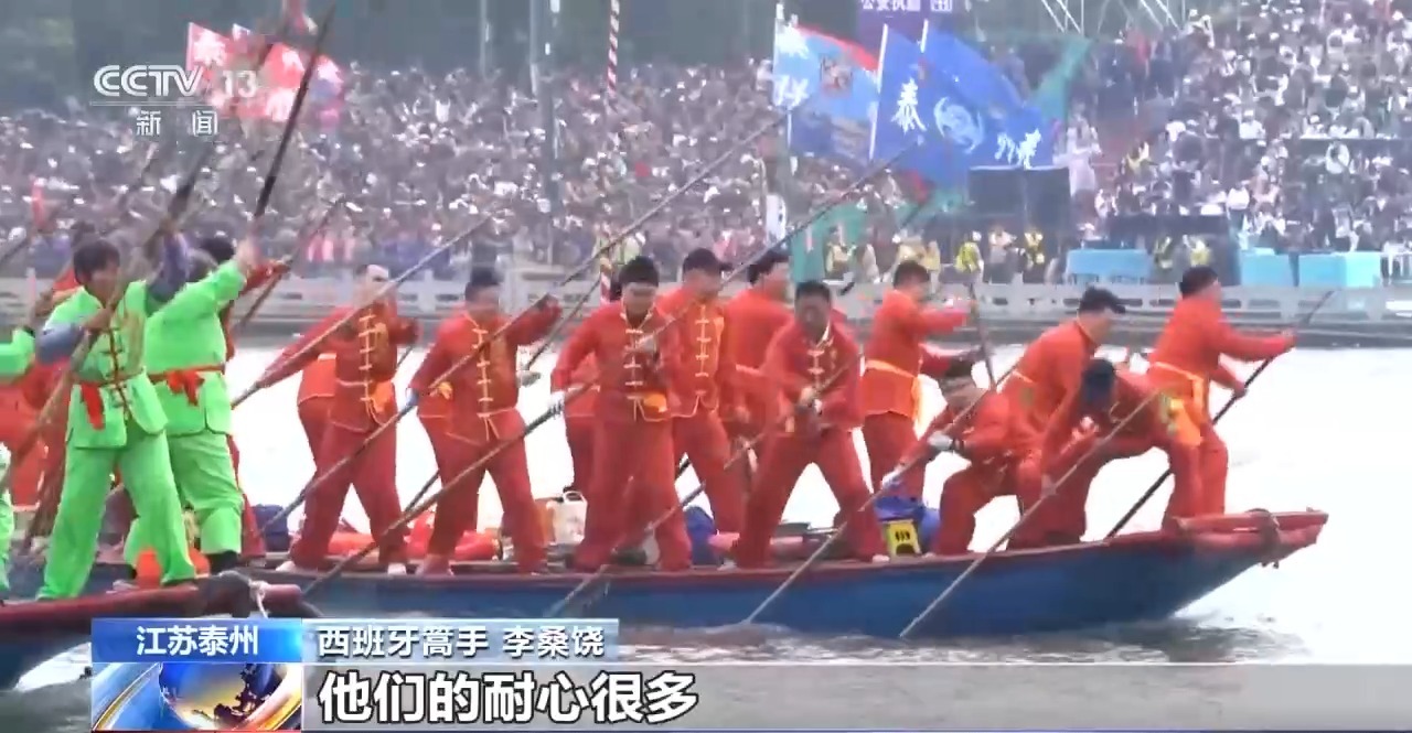清晨的溱湖,锣鼓震天。穿着水乡传统服饰的西班牙小伙李桑饶成为湖面焦点。他和队友们齐声呐喊、同步发力,撑着篙船奋力冲向终点。虽然最终与领奖台无缘,但满头大汗的他,说一点也不遗憾。