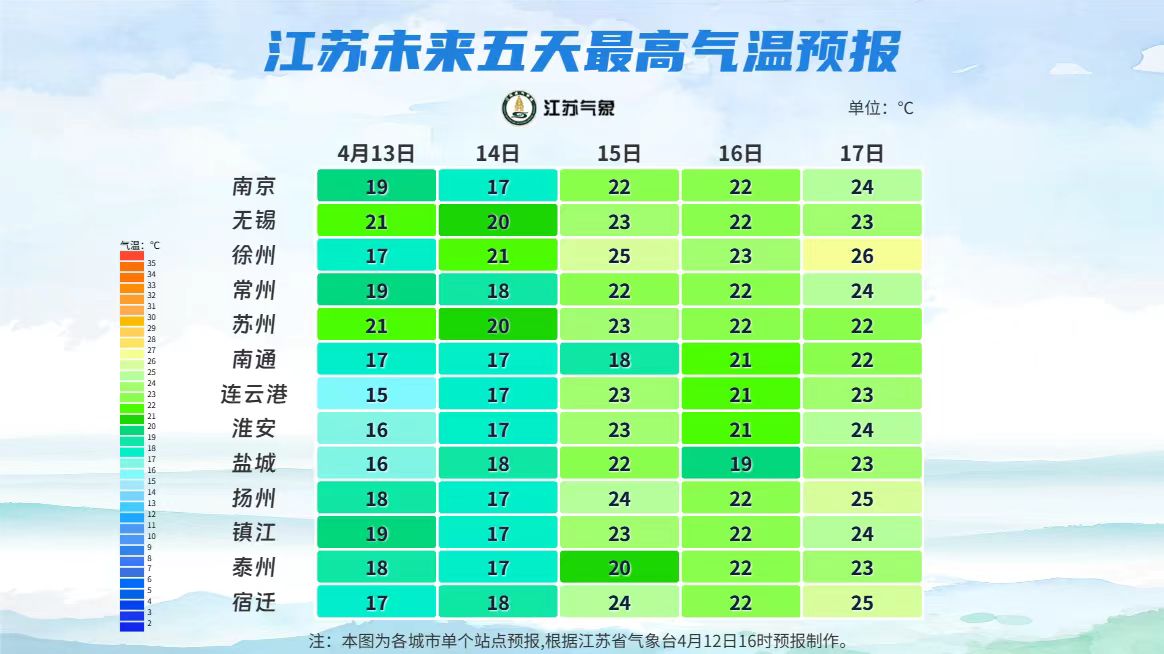 交汇点讯 刚刚过去的周末,江苏都“笼罩”在雨水中,甚至连“苏超”赛事也在雨中进行,这个下雨天还将持续三天。根据江苏气象4月12日17时发布的最新天气消息,针对江苏省内天气情况,未来三天淮河以南地区将持续多阴雨天气,全省气温也将迎来先降后升的走势。