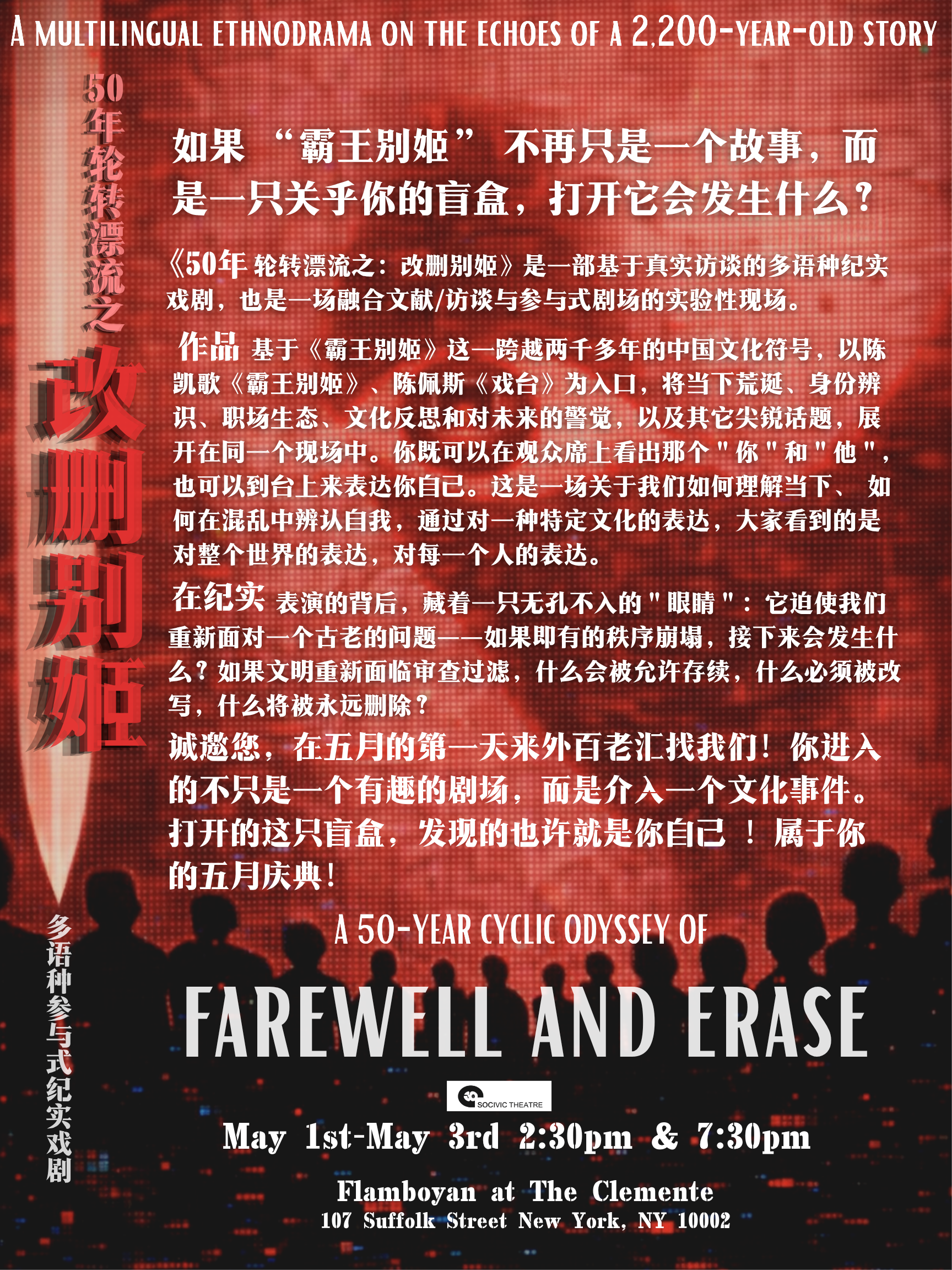 诚邀您前来观看并报道《Farewell, and Erase(改删别姬)》纽约首演。演出将于 2026年5月1日至3日在 The Clemente’s Flamboyán Theater 上演。媒体票、采访预约及更多资料可按需提供。