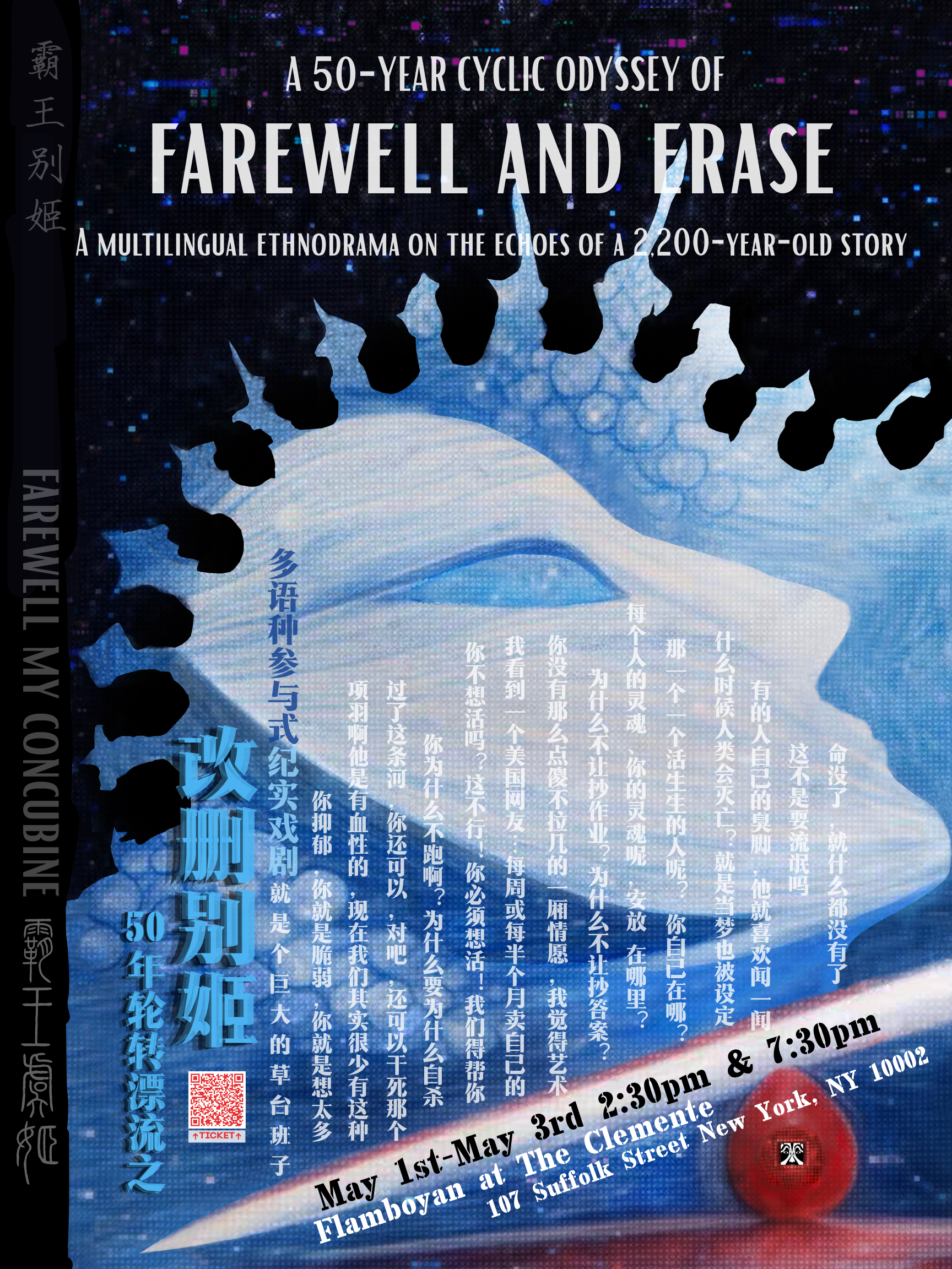 《Farewell, and Erase(改删别姬)》是一部多语纪实戏剧(ethnodrama)与参与式剧场作品,由龙格波丽编剧、导演,常近贤担任制作人,将于 2026年5月1日至3日在纽约 The Clemente’s Flamboyán Theater 首演。龙格波丽于 2025年12月完成纽约大学(NYU)社会与公民参与式戏剧硕士项目,本剧既是她的毕业创作,也是她毕业后在纽约正式呈现的首部完整原创作品,标志着她从学术研究走向公共舞台的一次重要实践。
