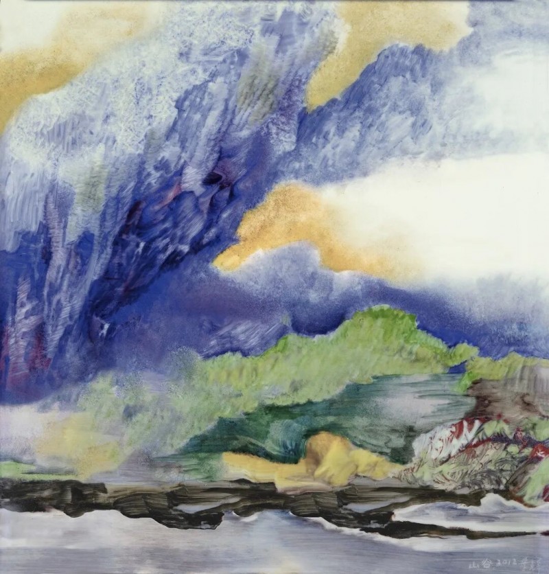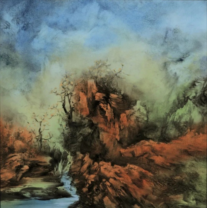 《山谷》的创作则暗藏巧思,“谷”既指稻谷,呼应酿酒的五谷本源,也指向酿酒所需的独特地理环境。张景辉回忆起探访酒厂与藏酒洞窟的经历:“好酒的酿成离不开特殊的地形与气象,就像五粮液的酒,地理与自然的馈赠是不可或缺的。”画作以山谷的特殊环境,隐喻酿酒过程中自然的净化、发酵与提纯,同时也暗合陶瓷艺术需经沉淀淬炼的匠心,实现了两种文化的深层共鸣。
