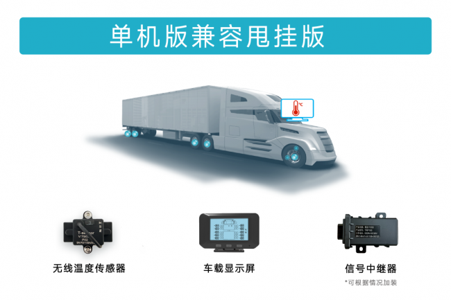 该设备由无线温度传感器、信号中继器、车载显示屏构成,通过433MHz无线射频信号连接,形成“温度采集→信号传输→实时显示→智能报警”的监测闭环。