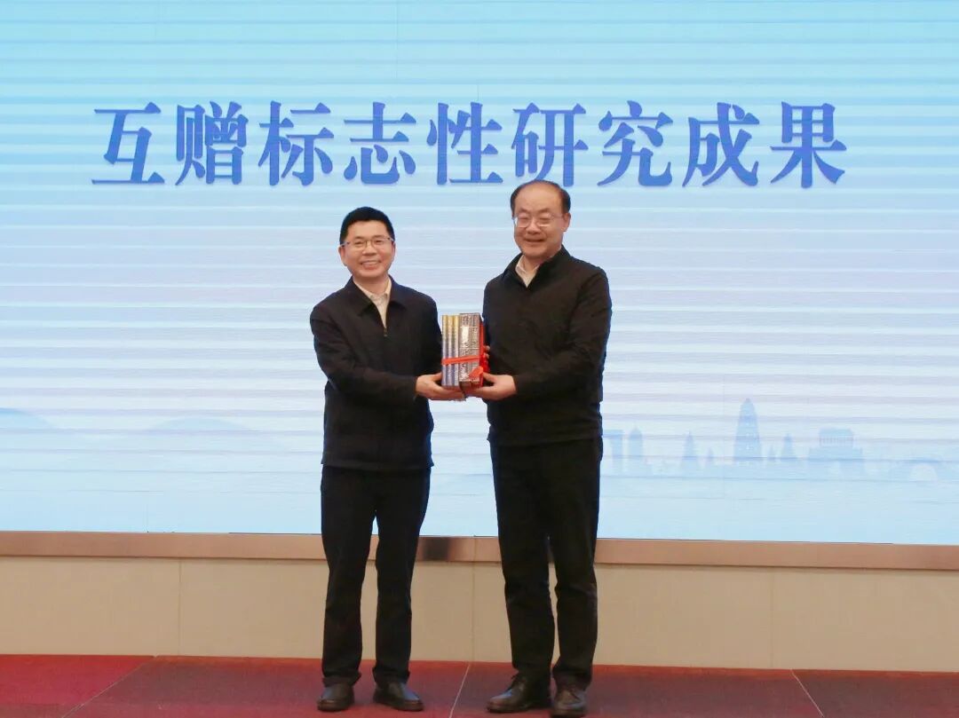 随后,苏州市委宣传部常务副部长、市新闻出版局(市版权局)局长韦国岭与北京市社会科学院党组副书记、副院长杨伟国互赠两院标志性研究成果,以书籍为媒,促进学术资源共享、南北文脉交融。