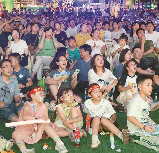 这一夜,南京小学生蔡明妤结束了一天的足球训练,正和家人聚在电视前目不转睛;银杏里文化艺术街区广场大屏上,转播着比赛现场画面;无数手机、电脑屏幕汇聚成一片银蓝色的光,城市的夜晚再次被“苏超”点亮。