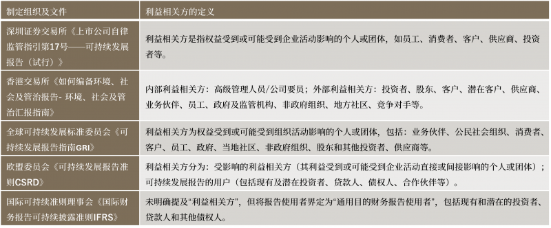 准确界定利益相关者的范围,是企业搜集相关者反馈的重要前提。对于在华外企来说,相关者的界定需要参考多方组织的标准。以下表格整理了各组织对“利益相关者”的定义,便于快速对比和理解不同标准对利益相关方范围界定的要求。在标准的基础上,通过咨询人力资源、法务、销售和市场等各部门,企业可整理出一份详细、完整的利益相关者名单。