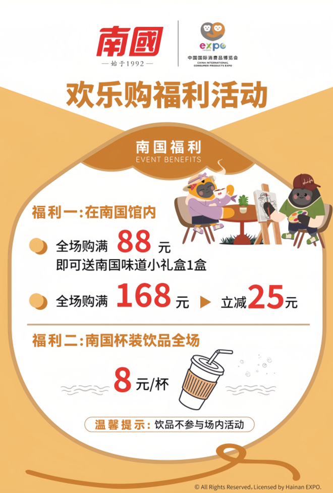 作为海南本土老字号品牌,南国始终以开放姿态拥抱行业机遇。本届消博会期间,南国将在3号馆3D07和登陆大厅品牌体验区面向全球渠道商、经销商、连锁商超、电商平台、社群团购等合作伙伴,开放全系列产品的招商合作权限,涵盖南国旗下固体饮料、糖果、饼干、休闲零食、调味品和全营养功能食品等多元品类,期待各位合作伙伴莅临展位,洽谈合作、共话发展!
