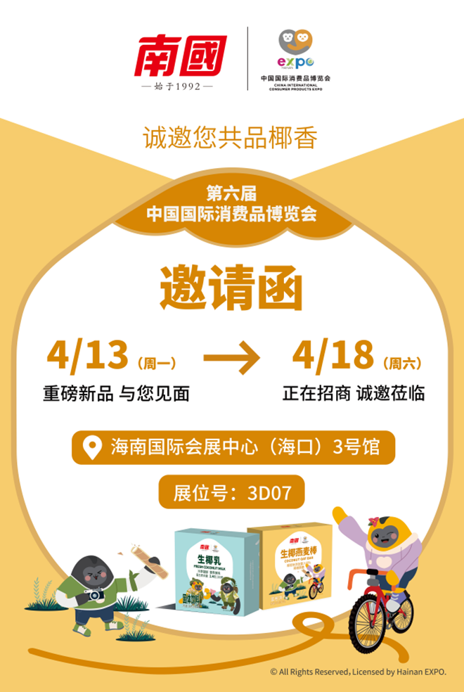 4月13日至18日,第六届中国国际消费品博览会将在海南国际会展中心盛大启幕,南国食品已整装待发,携全新产品矩阵、专属福利活动,在3号馆与登陆大厅,静候各位新老朋友、合作伙伴的到来!