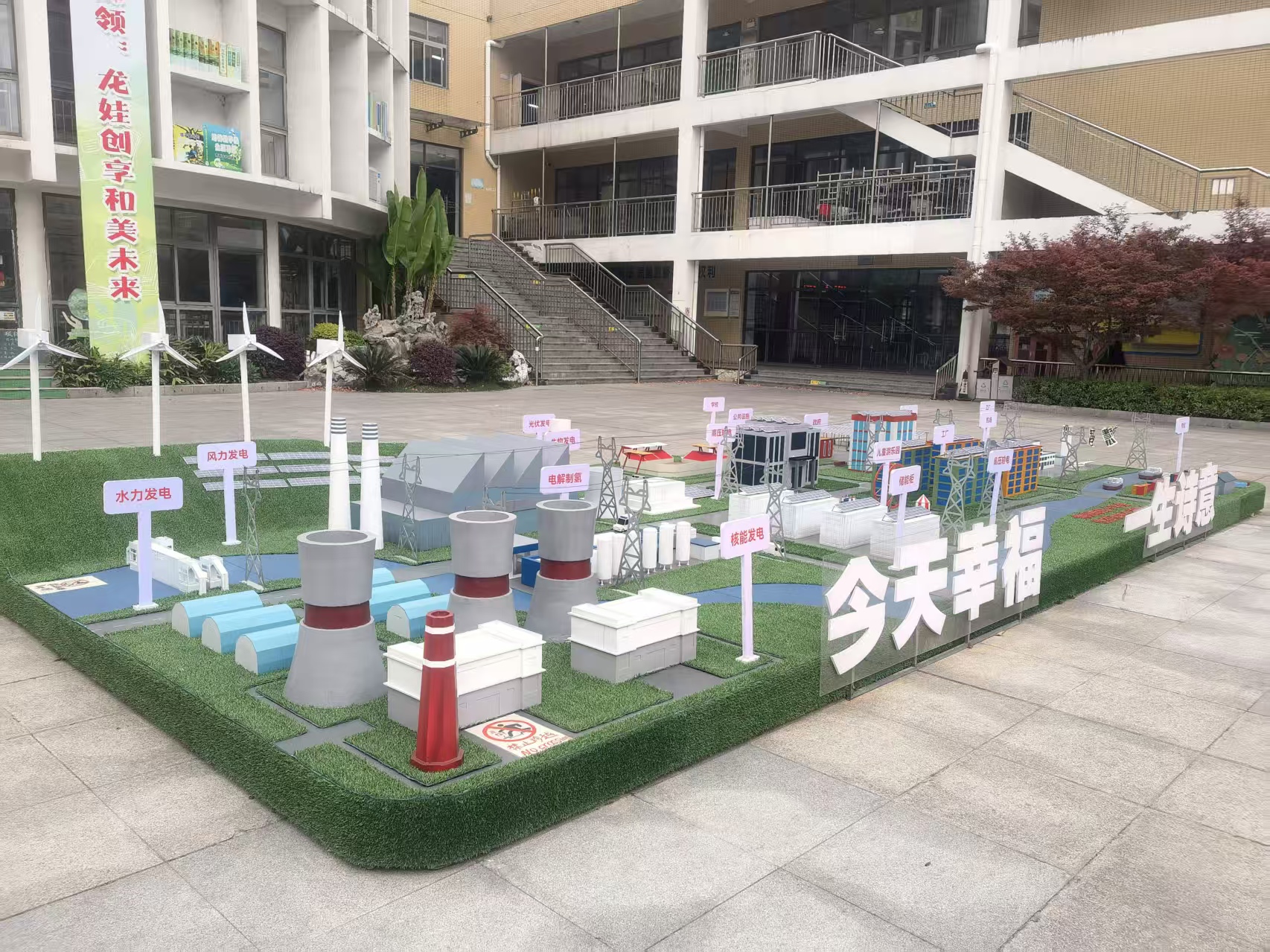 走进校园,绿意扑面而来,仿佛走进一座藏在校园里的“生态乐园”。教学楼外,绿色环保宣传条幅随风轻扬;广场中央,一座占地50平方米的“智慧能源岛”沙盘格外吸睛,风电、光伏、核能等新能源从发电、储能到输电、应用的全流程,被立体生动地呈现出来,这也成为孩子们课间最爱聚集的打卡点。