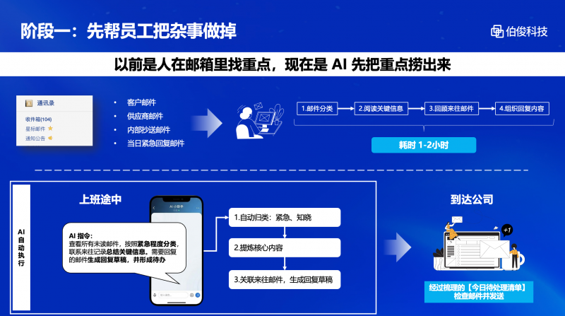 现在通过“伯俊龙虾”(BurgeonClaw),员工在上班途中就能给 AI 下达指令。AI 会自动整理邮件、总结关键信息、形成回复草稿,并列出代办事项。当员工坐到工位时,他面对的不再是密密麻麻的邮箱,而是一个清晰的工作台,只需要检查一下草稿内容和附件,一键提交即可。