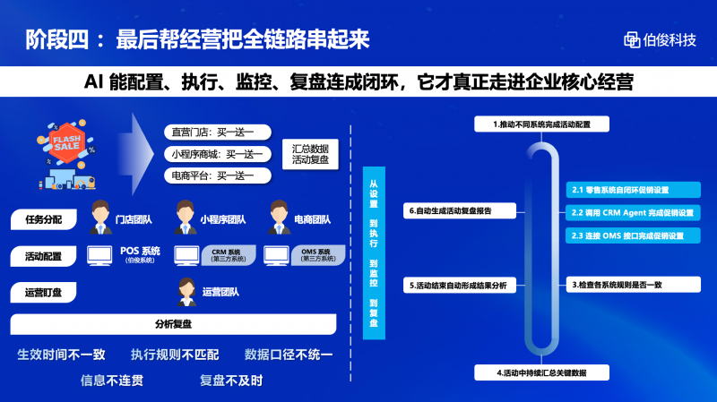 假设企业要做一场全集团的促销活动,涉及门店 POS、小程序、电商等多个系统。最头疼的情况是,POS 是伯俊的,但小程序和电商是第三方的。以往运营团队得在不同系统里录三遍活动,一旦信息失真,就会导致线上线下活动不一致,引发资损或舆情。