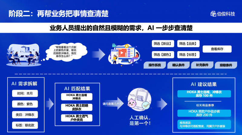 但这还不够。在这个阶段,我们引入了“预判机制”。AI 会思考:你为什么要查这件冲锋衣?是因为滞销了还是想提销量?如果它判定这是一款新品,就会主动建议:“现在是春天,露营徒步很火,建议搭配这款户外徒步裤一起售卖”。