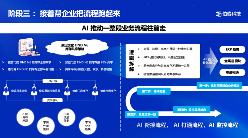 更关键的是实时监控。当发生异常(比如可能超卖)时,它不是扔出一个错误报告让用户自己去查,而是能自动化地解决问题并直接给出答案。这一阶段,AI 衔接了流程,让整个业务形成了闭环。