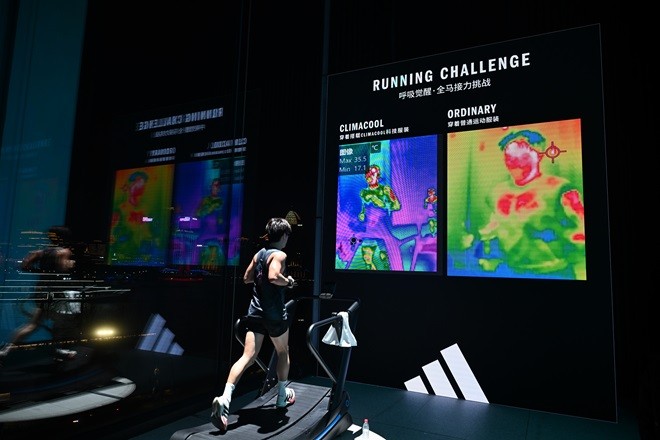 位于三楼的「呼吸实验场·全马接力挑战」,将CLIMACOOL的透气科技从展示转化为真实发生的运动体验。两组跑者在相同条件下进行持续跑动,其中一组穿着搭载 CLIMACOOL 科技的跑步系列装备,另一组则穿着未搭载 CLIMACOOL 科技的产品。通过热成像技术对体表温度进行实时监测,观众能够直观看到不同装备状态下的体感差异——更高效的空气流动带来更稳定的体温控制,从而支持运动中的持续输出表现。