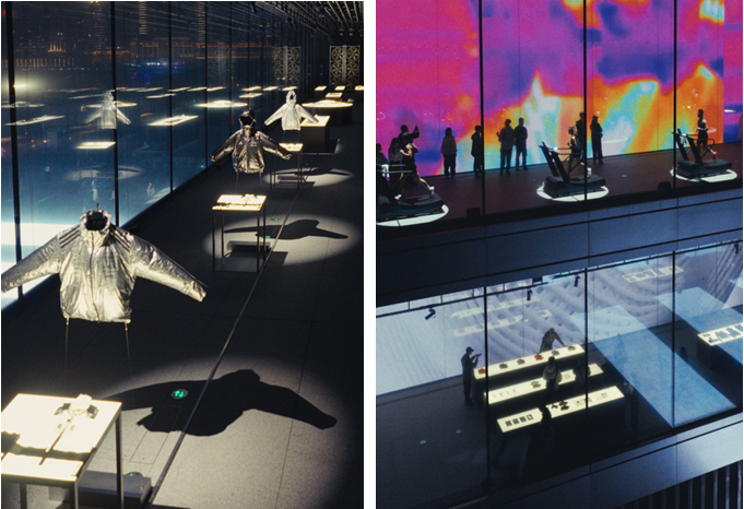 位于二楼的「呼吸科技创新展厅」,从精英运动员的赛场需求出发,逐步延展至生活方式与美学表达。在入口区域,首先呈现围绕极端环境温控需求打造的预冷系统产品,包括应用于F1场景的预冷夹克与背心,以及源自“Nardò Chasing 100”(逐百挑战)项目的装备系列。